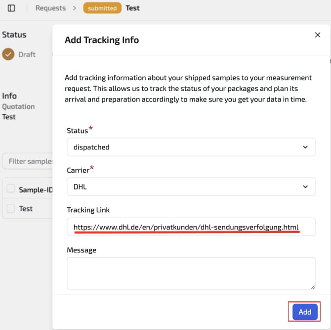 To actively monitor your shipment and ensure its proper handling, it is necessary to provide us with the tracking link in your request once your samples are dispatched. Please follow the steps below to provide the tracking number: